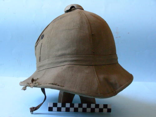 Calotta a sei sezioni sormontata da calottino in lamiera con tre fori di aerazione; tesa larga; due fori di aerazione laterale. Fascia posta sopra la tesa, fissata tramite un passante. Taschino in posizione laterale. Rivestimento interno color verde. Sottogola a cinturino regolabile, fissato con gancetti metallici all'interno.