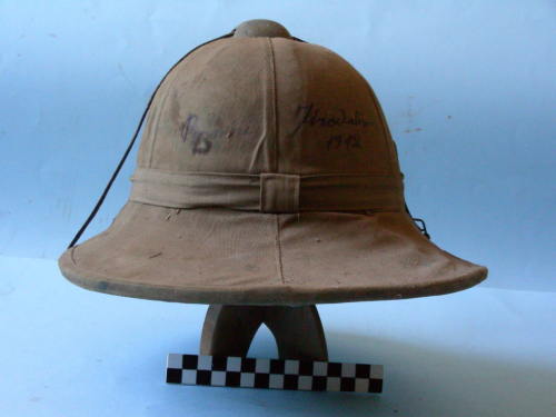 Calotta a sei sezioni sormontata da calottino in lamiera con tre fori di aerazione; tesa larga; due fori di aerazione laterale. Fascia posta sopra la tesa, fissata tramite un passante. Taschino in posizione laterale. Rivestimento interno color verde. Sottogola a cinturino regolabile, fissato con gancetti metallici all'interno e passante all'interno del calottino.