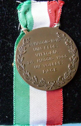 disco inciso recante sul diritto al centro un elmetto; sul retro una scritta attorniata da due rami (uno di quercia e uno di alloro) incrociati in basso e legati da un fiocco. Il nastro è composto dal tricolore italiano.