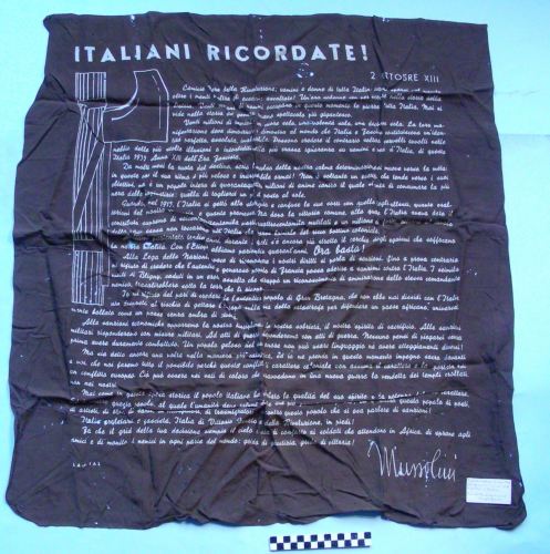 fazzoletto in tela marrone stampato con scritte in bianco. In alto a sinistra l'angolo è ornato da un disegno di fascio littorio con scure verso destra.