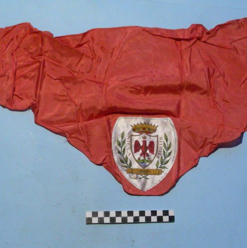 di forma triangolare di colore rosso, cucito al vertice uno scudetto comprendente scudo con aquila di rosso, col volo abbassato, poggiata su un monte di tre cime di verde, uscente da un mare d'azzurro fluttuoso d'argento. Sullo scudo corona turrita d'oro, ai lati motto e due serti di foglie. Sotto lo scudo un fascio littorio di secondo tipo, con nodo sabaudo.