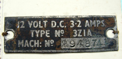 - ISCRIZIONI su tutta l'etichetta - 12 VOLT D.C. 3.2 AMPS TYPE No.3ZIA MACH:No. 294874 - Alfanumerici - in rilievo - inglese