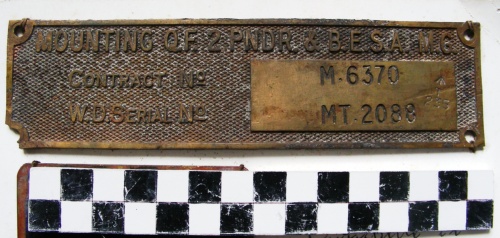 - ISCRIZIONI sull'etichetta più grande - MOUNTING Q.F. 2 PNDR. & B.E.S.A. M.G. CONTRACT No. W.D.SERIAL No. - Alfanumerici - in rilievo - inglese