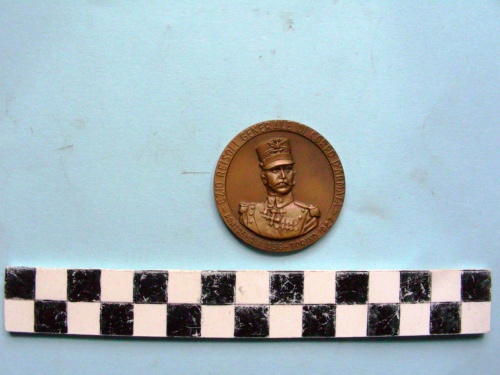 Recto: iscrizione sulla corona, al centro bassorilievo di ufficiale superiore in alta uniforme con nastrini e decorazioni. Verso: iscrizioni sulla corona ed al centro.