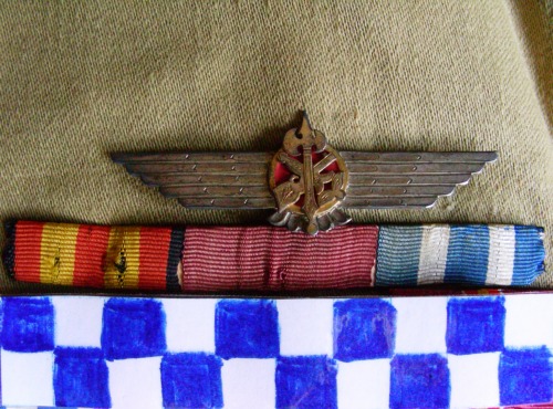 Spilla con ali argentate di aquila spiegate e penne della coda con bomba centrale di colore rosso contornata d'oro con armi incrociate sormontate da alabarda. Serie di tre nastrini sottostanti, il primo con bordi neri, tre strisce rosse alternate a due strisce gialle. Il secondo di colore amaranto. il terzo con tre strisce azzurre e due bianche.