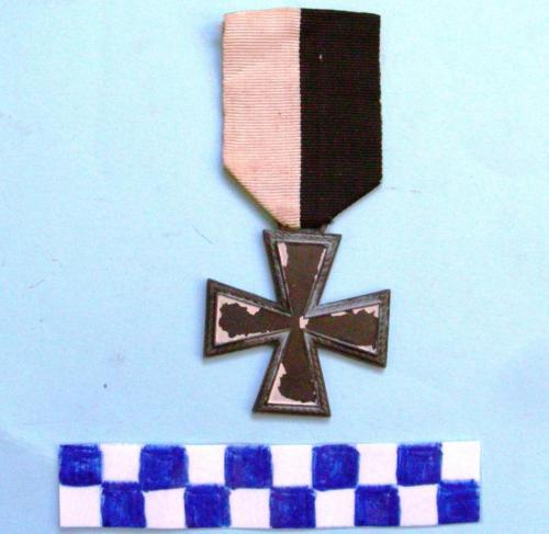 Croce patente attacco fisso a cambretta, smaltata in bianco ghiaccio bordata da un cordone argentato. Sul verso incisioni. Nastro bianco bipartito