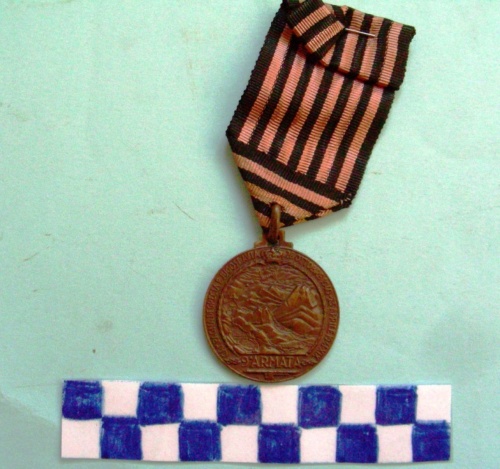 Disco di metallo, sul dritto in rilievo scenario montagnoso albanese attorniato da corona d'alloro culminante nella corona reale, nella parte inferiore fascio littorio rivolto verso il basso. Iscrizioni sulla corona ed all'interno del paesaggio. Sul verso al centro aquila bicefala albanese ad ali spiegate sormontata da corona reale tradizionale entro corona di nodi sabaudi, iscrizioni lungo la corona. Nastro con 7 strisce nere e 6 strisce rosa alternate.