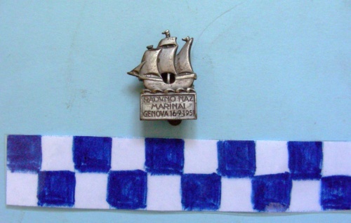 Distintivo a forma di caravella a viele spiegate che naviga verso sinistra con sottostante riquadro che contiene un'iscrizione. Sul verso l'oggetto è fermato da una linguetta a forma di goccia per il fissaggio all'occhiello.