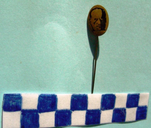 Di forma ovale smaltata di colore bronzo con al centro il ritratto stilizzato in nero del volto di Mussolini visto di fronte. Sul verso lunga spilla di fissaggio ed iscrizione