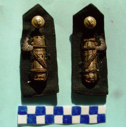 Coppia di controspalline con bottone ferma-passante e fregio a forma di fascio littorio, in canottiglia dorata, una con scure verso sinistra e l'altra con scure verso destra. I bottoni, dorati, sono decorati da un fascio littorio con scure verso destra e sono fissati ad un asola tramite vite avvitabile..