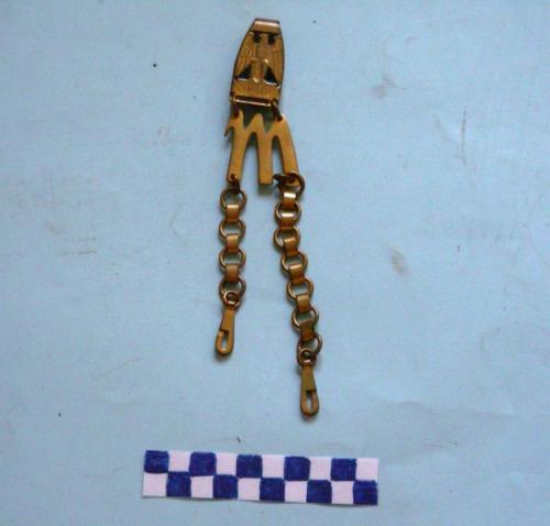 Sospensione snodata per pugnale, moschettone superiore che porta in rilievo, su sfondo nero, un'aquila dorata che trattiene tra gli artigli un cartiglio con l'acronimo S.P.Q.R. Al moschettone è appesa tramite due anelli una "M" stilizzata e dorata da cui partono due pendagli, costituiti da due catenelle dorate di viversa lunghezza, terminanti con due piccoli moschettoni per il fissaggio del fodero del pugnale.