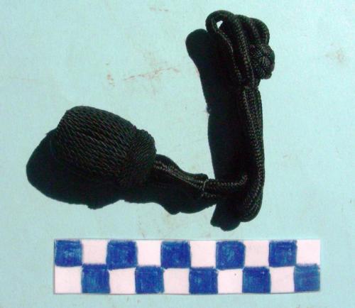 Cordoncino di colore nero con nottolino scorrevole, decorato in rilevo e terminante con noce decorata con fili di colore nero.
