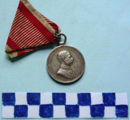 Di forma circolare. Sul recto al centro, in rilievo il profilo a destra dell'imperatore in grande uniforme. Iscrizioni sulla corona e sotto la spalla destra. Sul verso trionfo di bandiere sormontate da corona d'alloro, iscrizione al centro. Nastrino ripiegato a formare un triangolo con strisce rosse su fondo bianco, sul nastrino sono applicate due daghe dorate incrociate.