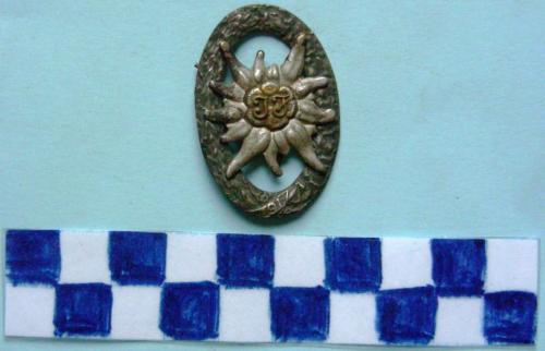 Di forma ovale, vuoto, decorazioni floreali lungo la corona circolare. Al centro grande stella alpina con monogramma al centro. Sul verso due spilli di fissaggio..