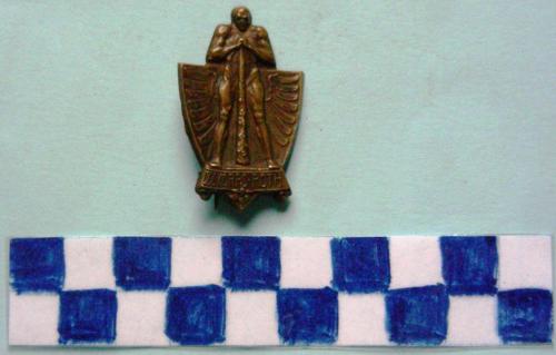 Spilla rappresentante un guerriero nudo che tiene con entrambe le mani una clava appoggiata a terra. In secondo piano uno scudo con ali spiegate di aquila. Ai piedi un cartiglio con sottostante stella alpina. Sul verso spilla per il fissaggio.