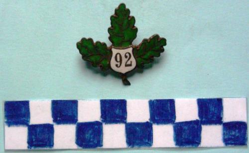 A forma di spilla con tre foglie di quercia di colore verde, al centro uno scdo con un numero argentato in campo bianco. Sul verso spilla per il fissaggio.