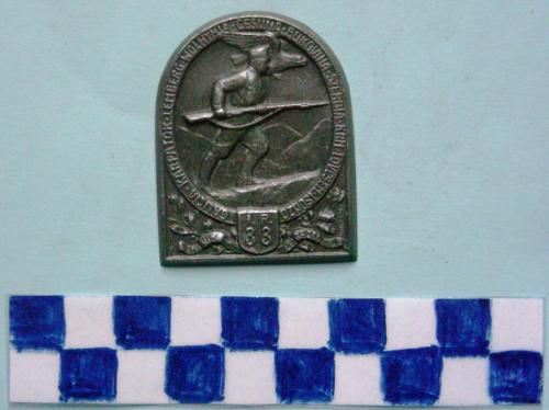 Di forma rettangolare con lato superiore arrotondato. Al centro, in rilievo, un soldato voltato a destra, con fucile spianato, sottostante un' aquila in volo su sfondo montano. Iscrizioni nella parte inferiore entro uno scudetto e le sue fasce, intorno a tutta la corona e sul lato destro.