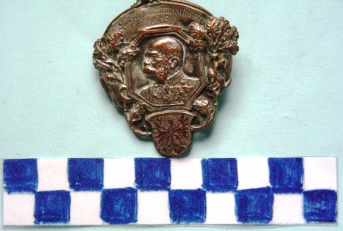 Di forma ovale. Nella parte superiore una iscrizione. Al centro in rilievo, in ottagono tra fronde di quercia il profilo a sinistra di Francesco Giuseppe con sottostante scudo con aquila ad ali spiegate . Sul verso spilla di fissaggio