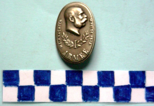 Di forma ovale. Nella parte superiore, in rilievo, a destra, il profilo della testa di Francesco Giuseppe con sottostante serto d'alloro. Iscrizioni ai lati e nella parte inferiore. Sul verso spilla di fissaggio