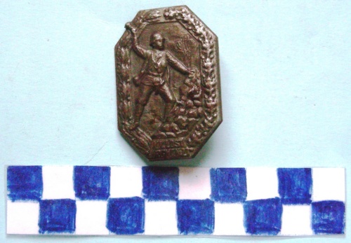 Di forma ottagonale, con i lati decorati con rami di quercia e di alloro. Al centro, in rilievo, un soldato al riparo di un muro di sassi, nell'atto di lanciare una bomba a mano a destra. Iscrizione sottostante in rettangolo. Sul verso, spilla di fissaggio.