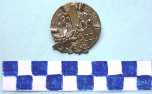 Di forma circolare con in rilievo, al centro, in posizione verticale un numero, con decorazioni floreali ai lati. Nella parte inferiore, a sinistra una stella alpina ed a destra uno scudo arrotondato, quadripartito con tre leoni stilizzati nel quadro a sinistra e zigrinature nei tre quadri di destra. iscrizione sulla parte superiore della corona. Sul verso spilla di fissaggio ed iscrizione.