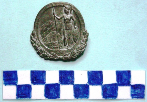 Di forma circolare, con rami d'alloro incrociati alla base. Al centro, in rilievo, a sinistra la dea Minerva con elmo, lancia e scudo e sottistrante paesaggio alpino con villaggio in basso a sinistra. Iscrizioni a sinistra, nel cerchio e sulla corona ai piedi ella dea. Sul verso spilla di fissaggio ed iscrizione.