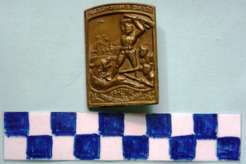 A forma di rettangolon con lato superiore arrotondato. Al centro, in rilievo due soldati con il fucile spianato, un ulteriore soldato, in piedi, nell'atto di colpire un orso ai suoi piedi con il fucile portato dietro la testa. In secondo piano un villaggio montano con nuvole ed un biplano in volo. Iscrizioni lungo il lato superiore ed inferiore. Sul verso, spilla di fissaggio ed iscrizione.