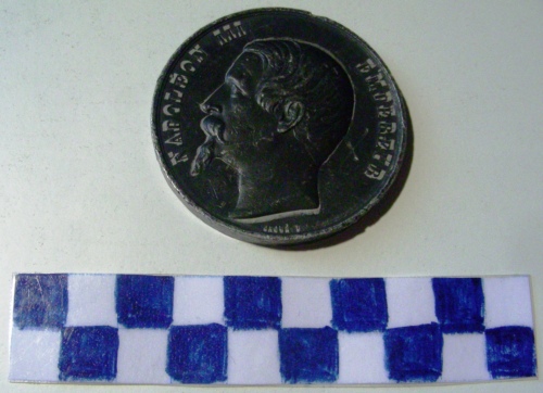 Di forma circolare. Sul recto busto accollato a sinistra di Napoleone III. Iscrizioni lungo la corona e illeggibile sotto la figura. Sul verso, figura allegorica femminile seduta su un trono che distribuisce a braccia aperte, alloro e medaglie. Ai lati, stilizzati, una ferrovia, un'ancora, strumenti di chimica. Iscrizione in esergo.