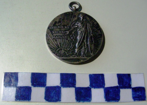 Di forma circolare. Sul recto, al centro, in rilievo, stella con sottostante serto di alloro legato da nastro, che interseca un ramo di palma. Iscrizione lungo la corona. Sul verso, in rilievo, figura allegorica femminile turrita, rappresentante l'Italia, che stringe uno scudo crociato nell'atto di indicare sullo sfondo la città di Milano posta davanti ad un sole raggiante che nasce. Iscrizioni alla sinistra della figura e in esergo. Anello all'appiccagnolo.