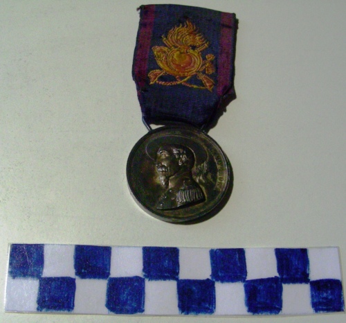 Di forma circolare. Sul recto, al centro, in rilievo, busto a sinistra del generale La Marmora in alta uniforme e con vaira. Iscrizioni lungo la corona e sotto la figura. Sul verso, iscrizioni sotto stella raggiante a cinque punte. Nastrino con lo stemma dei bersaglieri, dorato in campo blu con strisce laterali cremisi.
