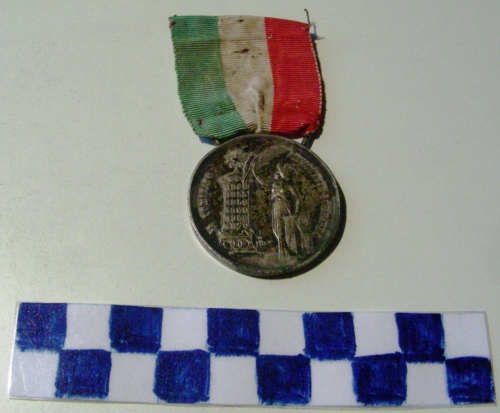 Di forma circolare. Sul recto, al centro, in rilievo a destra, allegoria dell' Italia turrita che regge con la mano sinistra una spada e scudo con croce sabauda. Con la destra alza un ramo di palma. A sinistra, un monumento con stella a cinque punte raggiante. Iscrizioni sulla colonna sotto la stella e lungo la corona. Sul recto, nella parte inferiore, un ramo di quercia e di alloro incrociati con iscrizione nel cartiglio. Nella parte superiore una stella a cinque punte raggiante. Iscrizione al centro. Nastrino tripartito verde, bianco e rosso.