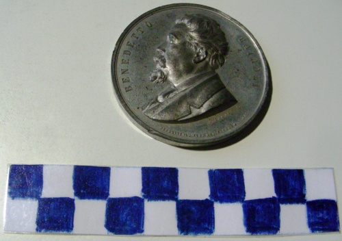 Di forma circolare. Sul recto, al centro, in rilievo busto accollato a sinistra di Benedetto Cairoli. Iscrizioni lungo la corona e sotto la figura. Sul verso, sotto stella raggiante a cinque punte in tondo, rami di quercia e d'alloro stretti da nastro con iscrizioni. Ulteriori iscrizioni al centro e attorno ai raggi della stella.