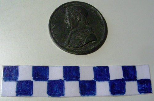 Di forma circolare. Sul recto, al centro in rilievo, busto accollato a sinistra di Pio IX con berretto, mozzetta e stola. Iscrizioni lungo la corona e sotto la spalla. Sul verso, in rilievo, angelo in volo, di fronte con cornucopia affiancato da due angioletti, uno con triregno e chiavi, l'altro con pergamena e bilancia. In esergo una città stilizzata con ansa di fiume Iscrizione lungo la corona ed illeggibili.
