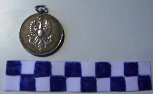 Di forma circolare. Sul recto, al centro, in rilievo ancora entro circonferenza. Iscrizione sulla corona. Sul verso, aquila della Regia Marina ad ali spiegate. Anello all'appiccagnolo.