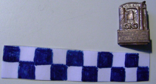 Di forma rettangolare con il lato superiore arrotondato. Sul recto, in rilievo fascio littorio a destra ornato da testa di leone, una piccozza che incrocia un bastone. Sullo sfondo un paesaggio montano. Iscrizione in rettangolo sottostante la figura. Sul verso spilla di fissaggio ed iscrizione.