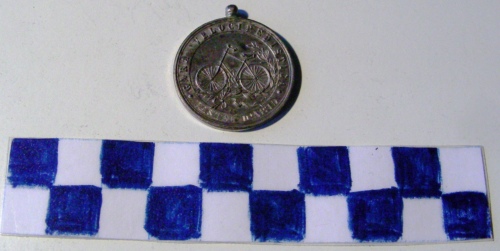 Di forma circolare. Sul recto, al centro, in rilievo, un velocipede a sinistra con sottostante decorazione di rami d'alloro legati da nastro. Iscrizioni lungo la corona. Sul verso, iscrizioni entro corona d'alloro e di quercia..