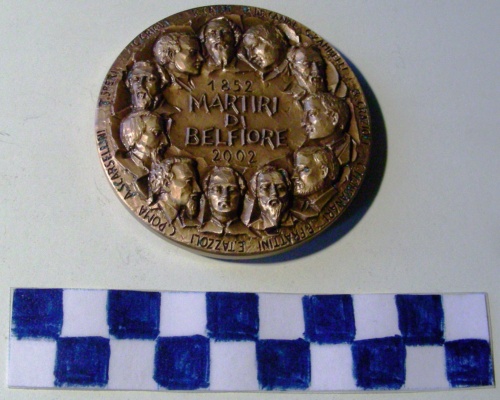 Di forma circolare. Sul recto, in rilievo, lungo la corona i busti accollati dei Martiri di Belfiore. Iscrizioni sulla corona ed al centro. Verso diviso in due parti. A destra nudo eroico di un giovane che regge con la destra, sopra la testa, una fiaccola e con la sinistra, lungo il fianco, un drappo. A sinistra tre sezioni concave e convesse con iscrizioni e con lo stemma della città di Mantova. Ulteriore iscrizione a destra della figura.
