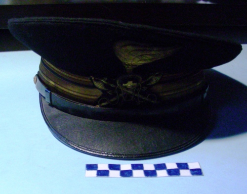 Di gabardina nera, con visiera e soggolo verniciati in nero, soggolo fissato alle tempie con due bottoni dorati e convessi, con stemma del corpo ed iscrizione. Al tamburo gallone di grado dorato e fregio del corpo ricamato in canottiglia dorata, sottopannata in nero. All'interno fodera di colore bianco ed etichetta.