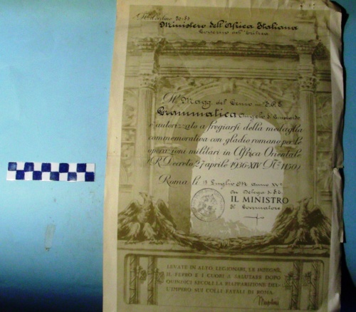 - ISCRIZIONI parte superiore - N° d'ordine 50183 Ministero dell'Africa Italiana Governo dell'Eritrea Il Magg. del Genio in S.P.E. Grammatica Angelo di Guiscardo è autorizzato a fregiarsi della medaglia commemorativa con gladio romano per le operazioni militari in Africa Orientale. (R.Decreto 27 aprile 1936-XIV N.° 1150) Roma li 13 Luglio 1937 Anno XV° Per Delega di S.E. IL MINISTRO Il Governatore (sigla) - corsivo - a stampa -