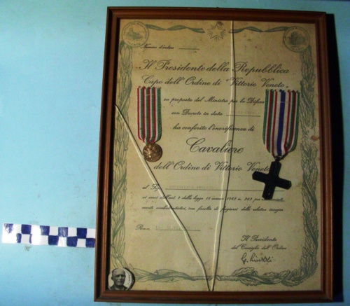 Di forma rettangolare con cornice. Diploma decorato a motivi floreali di colore verde lungo i lati laterali ed inferiore. Sul lato superiore al centro una stella raggiante e cinque punte ed agli angoli due medaglioni contenenti, a sinstra la raffigurazione del Castello del Buon Consiglio Trento ed a destra la Cattedrale di San Giusto Trieste. Ai lati sono cucite: a sinistra la medaglia concessa ai reduci con almeno sei mesi di partecipazione alla Prima Guerra Mondiale recante sul dritto in rilievo stella a cinque punte con sottostante elmetto Adrian su ramo d'alloro e di quercia incrociati. Sul verso iscrizione su due piccoli rami d'alloro. Nastro con 12 bande verticali verde, bianco e rosso ripetute 4 volte. A destra croce greca piena, incisa, caricata di uno scudetto a forma di stella a cinque punte con scritta. Sul verso un elmetto all'incrocio dei due bracci. Croce sorretta coi colori della bandiera italiana ed una riga azzurra centrale.