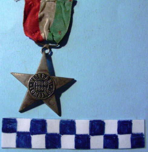 A forma di stella a cinque punte con doppio disco al centro con iscrizione. Anello all'appiccagnolo con nastrino tricolore.