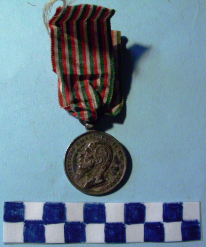 Di forma circolare. Sul recto, al centro, in rilievo, busto accollato a sinistra di Vittorio Emanuele II. Iscrizioni lungo la corona. Sul verso, al centro, in rilievo, figura allegorica femminile dell'Italia in piedi a sinistra con lancia e scudo sabaudo. Iscrizioni lungo la corona. Anello all'appiccagnolo e nastro con tricolore italiano ripetuto sei volte.