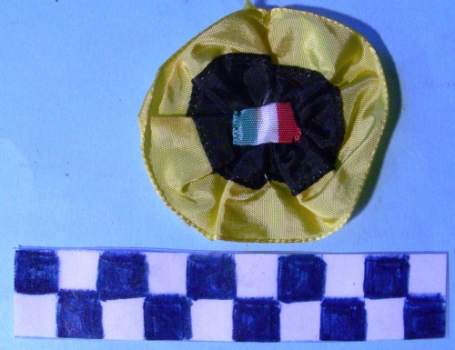 Di forma circolare. All'esterno corona circolare di colore giallo, all'interno, cucito un cerchio di colore nero con sovrastante nastrino riportante i colori nazionali.