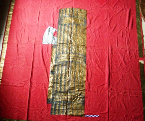 Di forma rettangolare di colore rosso, di grandi dimensioni con striscia dorata incollata lungo il perimetro. Al centro, incollato un fascio littorio ottenuto con strisce bruno-dorate e scure, a sinistra, di colore argento. Sul lato corto superiore sono cucite sei coppie di fettucce bianche per il fissaggio. Sul lato corto inferiore sono stati cuciti undici sigilli di piombo con funzione di contrappeso.