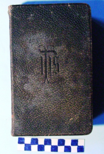 Copertina rigida di colore nero decorata con monogramma sulla prima e quarta di copertina. Controguardia di colore rosso scuro con linguetta a formare una tasca nel foglio di guardia posteriore. I tagli sono di colore rosso. Iscrizioni sul dorso. Iscrizione a penna sul primo foglio. Al capitello sono incollati due segnalibri di colore viola, due di colore rosso e uno di colore verde.