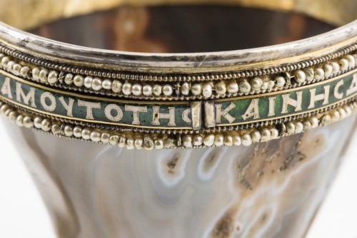 Base troncoconica in argento dorato, profilata da linee di granuli, con pietre incastonate di forma ovale. Coppa troncoconica liscia in sardonica, con interno bugnato. Orlo decorato da montatura in argento dorato con iscrizione a smalto bianco su fondo verde, distribuita su quattro placchette, compresa entro due file di perle profilate da linee di granuli. Munita di due anse piatte, impostate alla base della coppa e sulla parte inferiore della fascia lungo l'orlo, decorate da cabochons e da file di granuli