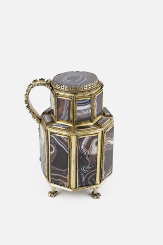 Base costituita da quattro piedini zoomorfi in argento dorato. Corpo ottagonale composto da lastre di sardonica inquadrate da una montatura in argento dorato, entro un perimetro di granuli. Imboccatura ottagonale di dimensioni inferiori ripetto al corpo, anch'essa composta da lastre di sardonica analogalmente al corpo. Coperchio piano in onice rifinito da elementi fitomorfici in argento dorato. Ansa che si imposta sull'orlo e sulla spalla in argento dorato decorata da elementi fitomorfici lungo i due lati