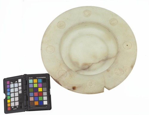 - NOTIZIE STORICO CRITICHE Le cavità circolari presenti sull'orlo dovevano ospitare altrettante decorazioni, forse in metallo o in pasta vitrea, oggi completamente perdute