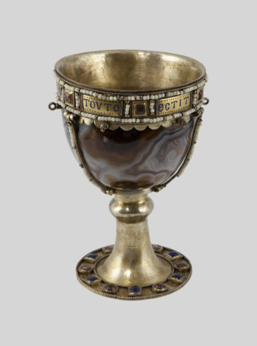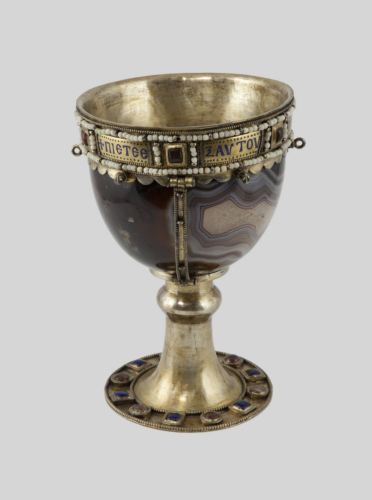 Alta base troncoconica in argento dorato, con rigonfiamento anulare verso la coppa. Lungo il diametro del piede vi è una fascia di cabochons, alternativamente rotondi e rettangolari, inclusi entro due linee di granuli. Coppa ovoidale in sardonica. Lungo l'orlo montatura in argento dorato costituita da una fascia delimitata in alto e in basso da una doppia linea di granuli con al centro una fila di perle. Nella parte centrale vi è una iscrizione a smalto blu divisa in placchette alternate a sei cabochons, anch'essi delimitati lateralmente da granuli e perle. Al di sotto corre una fascia di festoni semicircolari, su cui si impostano degli anellini. Tre strisce verticali, sempre decorate da granuli e perle, raccordano la montatura della base e dell'orlo