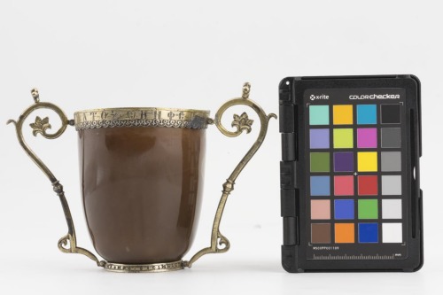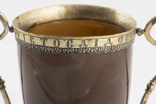 Basso piede ad anello in argento dorato, con iscrizione lungo il diametro compresa entro due modanature. Coppa subclindrica in agata, liscia, con fondo concavo e piccola base. Orlo profilato da una montatura in argento dorato con un'iscrizione incisa lungo il diametro, rifinita nella parte inferiore da un motivo fitomorfico. E' munito di due anse simmetriche in argento dorato, con andamento mistilineo. Poco sotto l'attacco inferiore al piede descrivono un angolo, sottolineato da un riccio vegetale; più in alto la curva è interrotta da un nodo poliedrico, e nella parte finale terminano in una voluta coronata da una fogliolina ed un elemento a quattro piccole sfere, chiusa da una palmetta a cinque petali